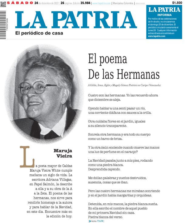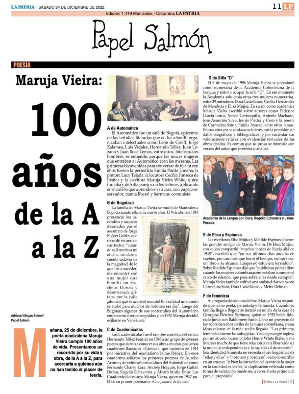 Reseña de Adriana Villegas Botero sobre Maruja Vieira "Mañana, 25 de diciembre, la poeta manizaleña Maruja Vieira cumple 100 años de vida. Presentamos un